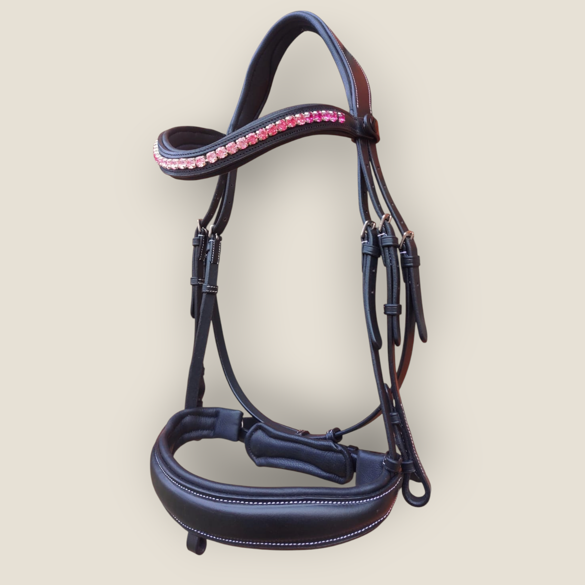 La testiera é compresa di morbidissime redini in tessuto con tacche e cuoio di prima qualità con cuciture bianche a contrasto come la testiera.