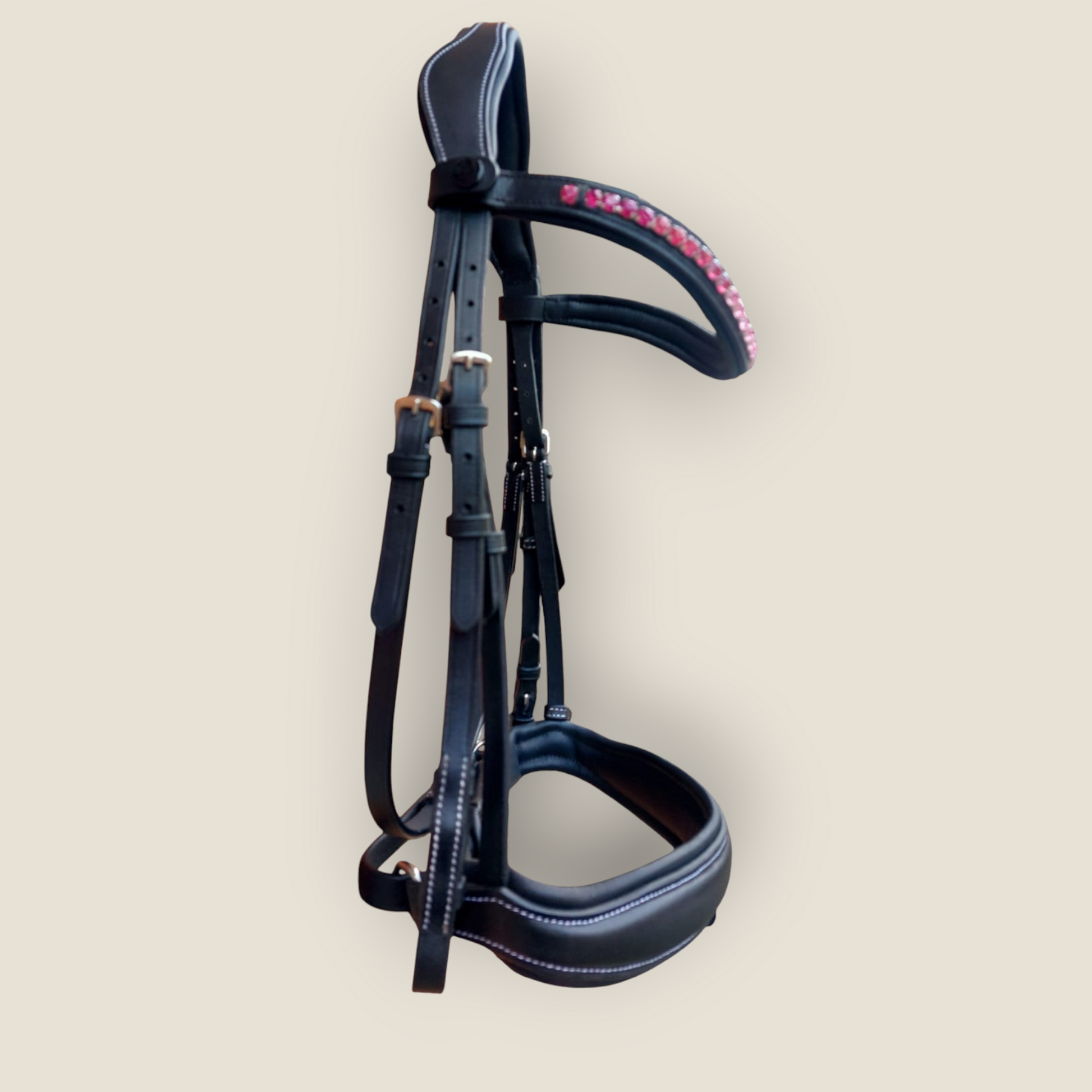 Realizzata in cuoio di primissima scelta superior primo fiore, morbidissimo al tatto, è rifinita con cuciture bianche a contrasto, curate in ogni dettaglio per un effetto raffinato e distintivo. Il suo design anatomico sulla nuca, dietro le orecchie e sul muso segue perfettamente la conformazione della testa del cavallo per evitare le pressioni nei punti sensibili. L'imbottitura extra large in foam rivestito di morbidissima pelle sulla nuca e su tutto il muso riduce i punti di pressione e garantisce un comfort superiore anche nelle sessioni più lunghe. Il design é stato studiato per non interferire con i principali fasci nervosi facciali, favorendo il rilassamento e il benessere totale del cavallo. Un elegantissimo frontalino a U anatomico imbottito con cristalli premium, con apertura rapida a click. offre un tocco di stile unico a questa testiera MyColleen.