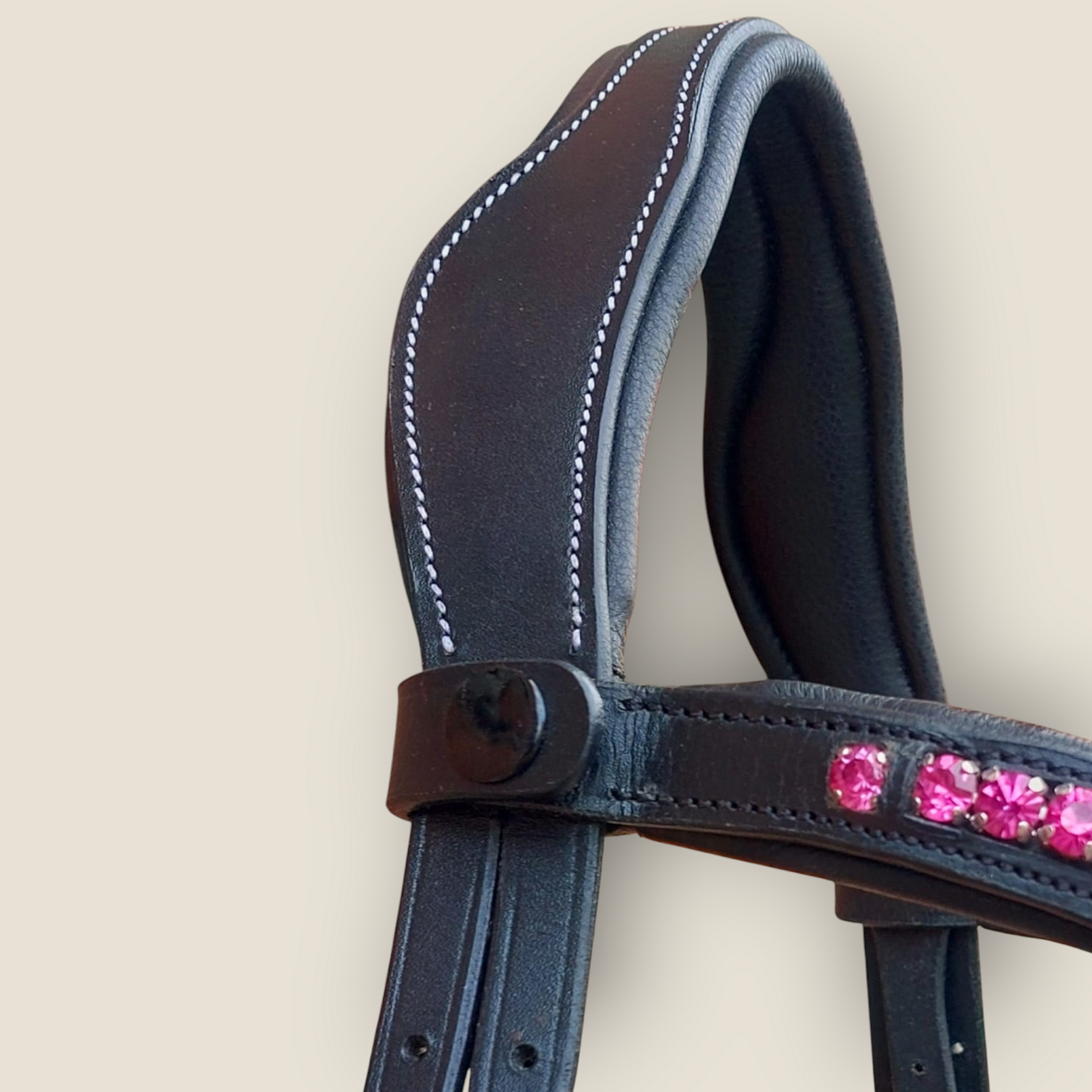 CUOIO PRIMO FIORE SUPERIOR COLORE NERO CON CUCITURE BIANCHE E FRONTALINO CON CRISTALLI PREMIUM ROSA AD APERTURA RAPIDA